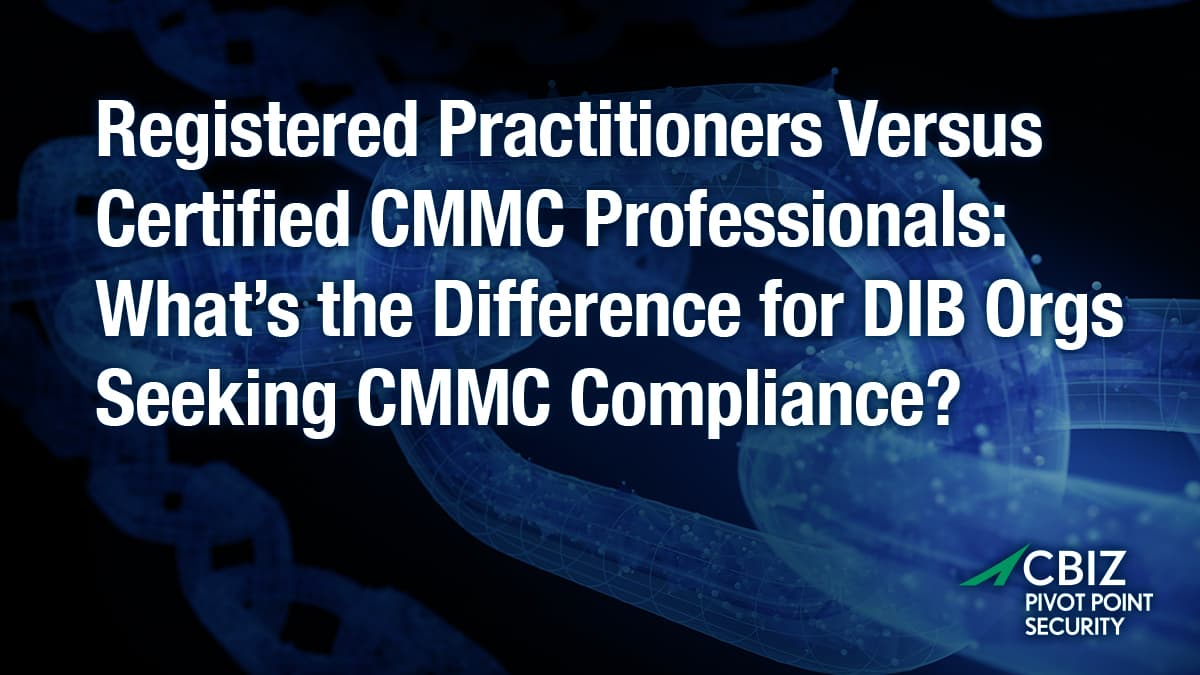 CBIZ Pivot Point Security offers a full complement of CMMC readiness services to help OSCs achieve and maintain CMMC compliance. Contact us to discuss your goals and questions with a CMMC expert.